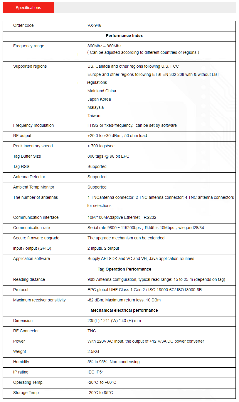 Name:VF-946 4 channels UHF RFID Fixed Reader