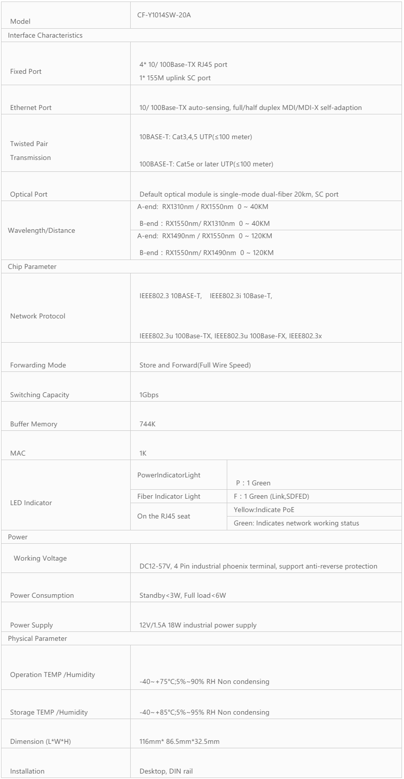 The CF-Y1014SW-20A is a 10/ 100M industrial Ethernet fiber switch independently developed by CF FIBERLINK. It is designed to meet industrial fields and systems and can operate stably for a long time in harsh environments. It has 4* 10/ 100M RJ45 port and 1* 155M uplink SC port. Each port can support full line-rate forwarding. CF-Y1014SW-20A industrial Ethernet switch has excellent industrial field environment adaptability(including mechanical stability, climate adaptability, electromagnetic environment adaptability, etc.), protection level up to IP40, It can support dual redundant power supply, low power consumption and no fan cooling technology, MTBF average trouble-free working time up to 35 years, 5-year warranty. It is suitable for industrial scenes such as intelligent transportation, rail transit, electric power, mining, metallurgy and green energy construction to form a cost-effective and stable communication network.