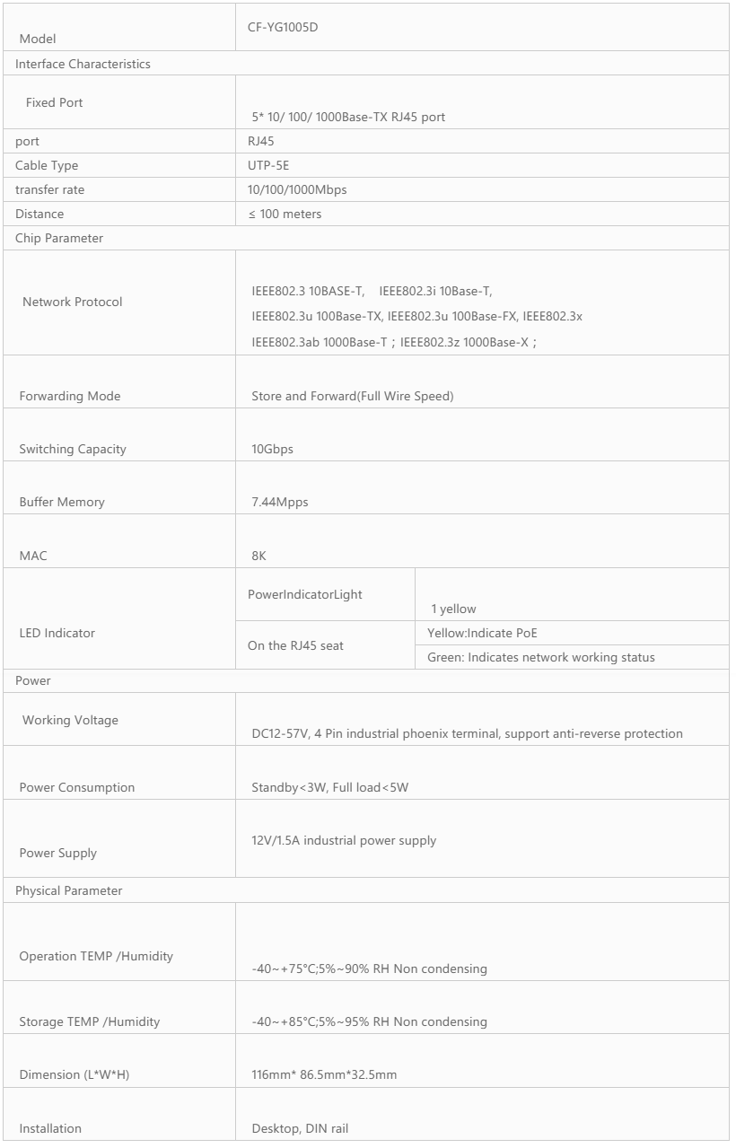 The CF-YG1005D is a 10/ 100/ 1000M industrial Ethernet switch independently developed by CF FIBERLINK. It is designed to meet industrial fields and systems and can operate stably for a long time in harsh environments. It has 5* 10/ 100/ 1000M RJ45 port . Each port can support full line-rate forwarding. CF-YG1005D industrial Ethernet switch has excellent industrial field environment adaptability(including mechanical stability, climate adaptability, electromagnetic environment adaptability, etc.), protection level up to IP40, It can support dual redundant power supply, low power consumption and no fan cooling technology, MTBF average trouble-free working time up to 35 years, 5-year warranty. It is suitable for industrial scenes such as intelligent transportation, rail transit, electric power, mining, metallurgy and green energy construction to form a cost-effective and stable communication network.