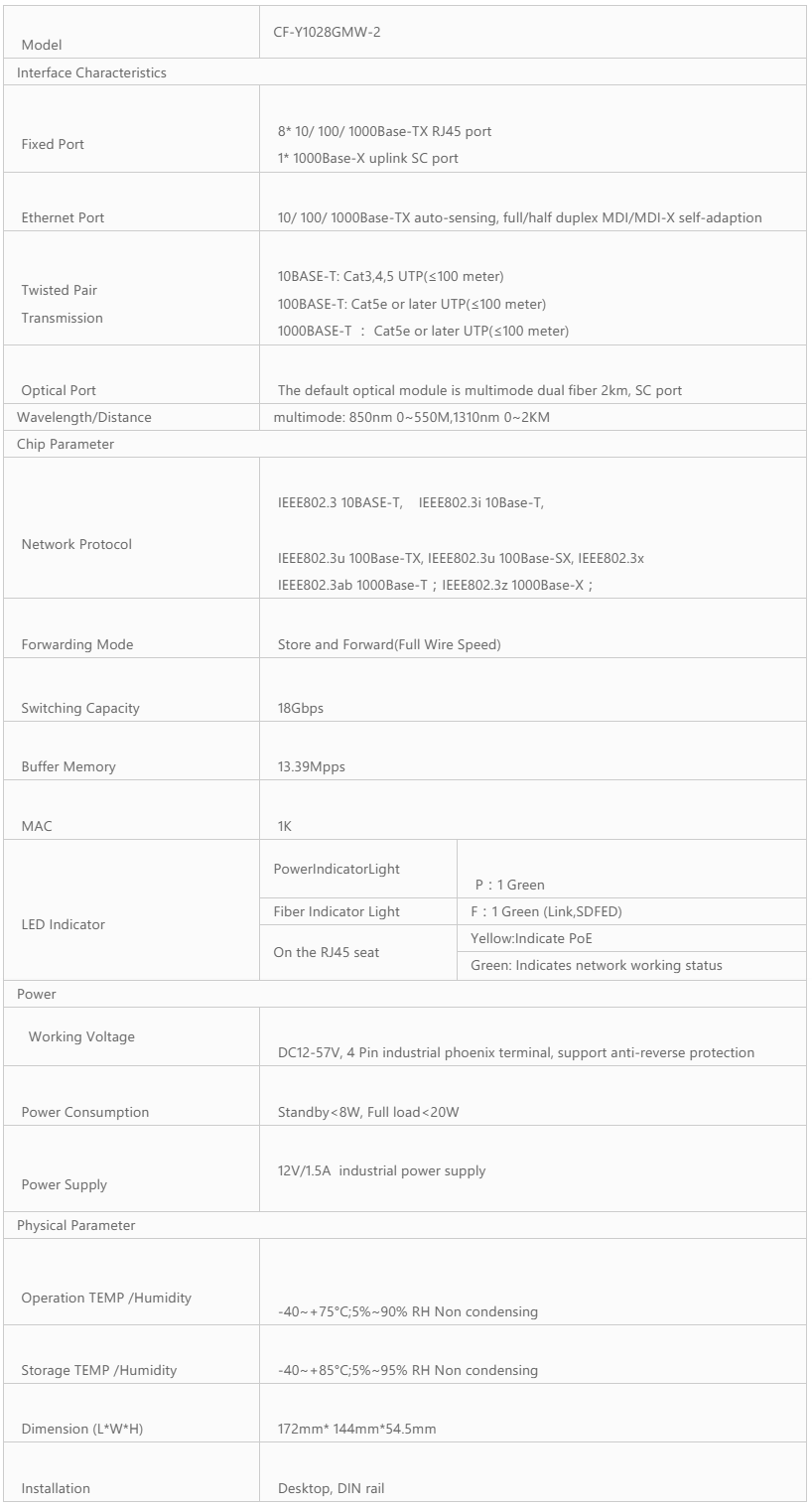 The CF-Y1028GMW-2 is a 10/ 100/ 1000M industrial Ethernet fiber switch independently developed by CF FIBERLINK. It is designed to meet industrial fields and systems and can operate stably for a long time in harsh environments. It has 8* 10/ 100/ 1000M RJ45 port and 1* 1000Base-X uplink SC port. Each port can support full line-rate forwarding. CF-Y1028GMW-2 industrial Ethernet switch has excellent industrial field environment adaptability(including mechanical stability, climate adaptability, electromagnetic environment adaptability, etc.), protection level up to IP40, It can support dual redundant power supply, low power consumption and no fan cooling technology, MTBF average trouble-free working time up to 35 years, 5-year warranty. It is suitable for industrial scenes such as intelligent transportation, rail transit, electric power, mining, metallurgy and green energy construction to form a cost-effective and stable communication network.